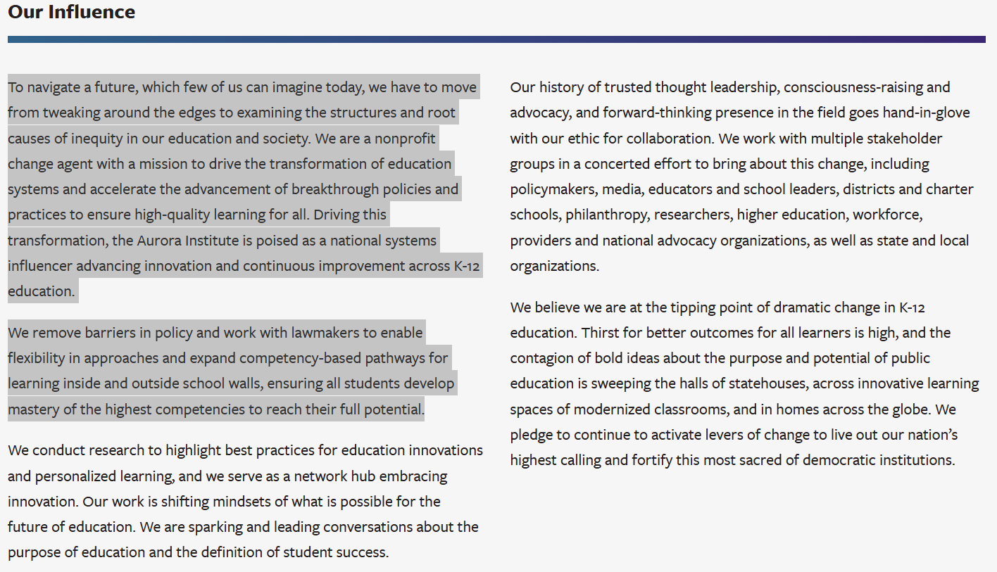 The Aurora Institute located in Washington, DC contracts with the WA State Board of Education to evaluate Mastery Based Learning in WA state. They are lobbyists more than education professionals who care about the academic excellence and success of WA state students. The data they collect through their analysis drives policies and legislation. Their reports are more of a “look at me, this is why we should all be doing this” report—the global worldview—rather than best practices to improve academic excellence for our students. They are focused on feelings and data, not a student’s need for or desire to be academically prepared for life post high school. According to a statement about “Our Influence,” direct from the Aurora Institute website:https://aurora-institute.org/